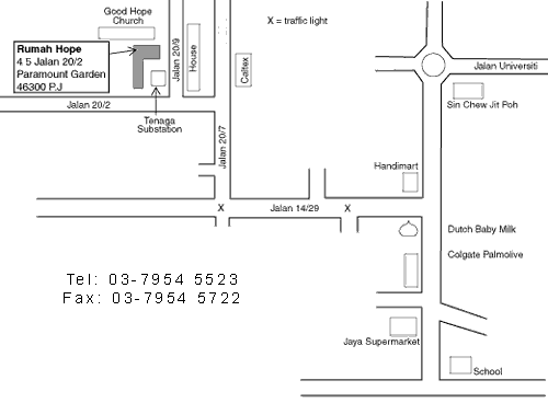 RUMAH HOPE 45 Jalan 20/2, Paramount Garden, 46300 Petaling Jaya, Selangor, MALAYSIA Tel: 03-7954 5523 Fax: 03-7954 5722 Email: hope2004@streamyx.com Will you chip in to create a new beginning for these children? It will mean so much to them.