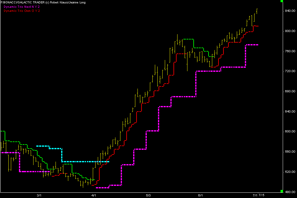 The latest readings of the KLCI still remain positive despite a bearish signal that occurred last Wednesday. The dreaded Bearish Engulfing Pattern reared its ugly head, panicking many investors and speculators on that day.My readings still remain positive. The market is still a very strong bull trend, denoted by a strong reading for the weekly Joseph Trend Index for the KLCI (Chart 1). The trend is intact as the Dynamic Trio Own & Next (DTO & DTN) step lines still hold the market up, despite last Wednesday's panic selling. The long position trailing profit stops of the DTO and DTN are as follows:- 811.42 and 775.46 respectively (Chart 2).