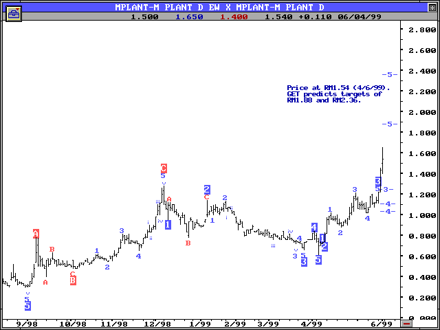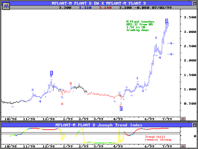Don't miss this seminar because we will pick out some fantastic stocks for you! A pick from my 5th June seminar was M Plant (RM1.54 on 4/6/99 but highest at RM 3.32 on 2/7/99!). Staggering prediction by myself using the GET software, eh? (Chart 3 & Chart 4).
